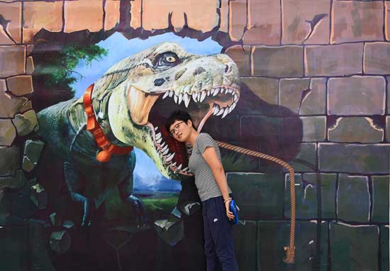 据介绍,3D魔画艺术又称“立体画展”,起源于上世纪60年代的“奇幻艺术”运动。它不仅是一个可观看的幻觉体验型艺术,更可以用于入画触摸,惊艳pose摆拍等亲身体验,如临其境,梦幻神奇。魔画一条街内,现有3D魔画十余幅,其中有美人鱼、海底世界、海豚、鳄鱼等。在这里,您仿佛走进时空隧道,与亿万年前的恐龙亲密接触;在这里,您不用去海洋馆或动物园,就可以与海豚、各种鱼类嬉戏玩耍,友好相处;在这里,您可以与金佛见面,求财、求福;在这里,您也可以与凌波仙子一样,在海浪的陪伴下,从大海深处缓缓走来。